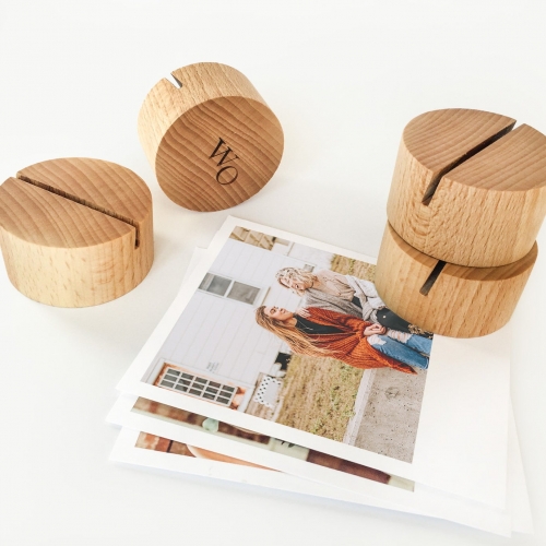 Round wood photo holder. This card holder is the perfect accessory for desk dresser or shelves. It can hold small art prints and photos of various sizes and shapes. Use it to rotate your favourite pictures or hold gift cards menus and table numbers! Handcrafted from solid eco-friendly wood. The groove is wide enough to accommodate different kinds of paper and photo sizes (up to 5×7). 100% natural bees wax + olive oil finishing.