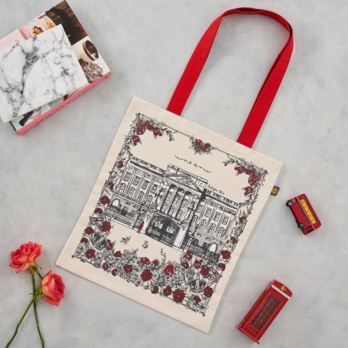 Say goodbye to plastic with our handmade Royally British Canvas Bag. Hand illustrated by Victoria Eggs to serve as a reminder of everything we love about the Royal family, this canvas bag features a view of the iconic Gold State Coach and corgis on the lawn of the Queen’s favourite residences; Windsor Castle, Buckingham Palace and Balmoral Castle. Handmade in Britain, printed on both sides, 10oz unbleached canvas.Dimensions: 38 x 43 / 14.9″ x 16.9″.Washing: Machine washable, max 40 degrees celsius. Turn inside out before washing.Keywords: Queen, Queen Elizabeth, Queen Elizabeth the 2nd, London, England, Royal, Buckingham Palace, U.K, gift, bag, canvas, shopping, sturdy, Britain, British, Capital, U.K