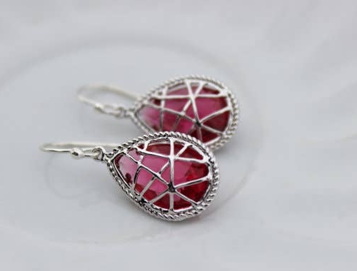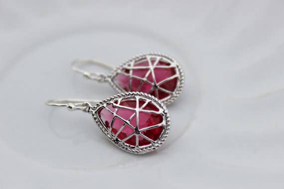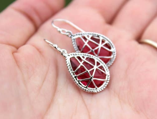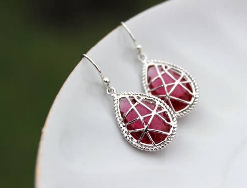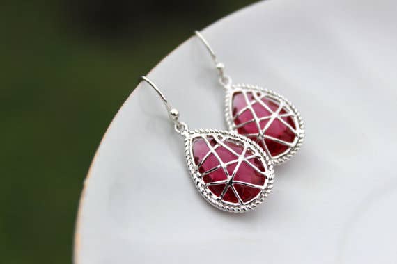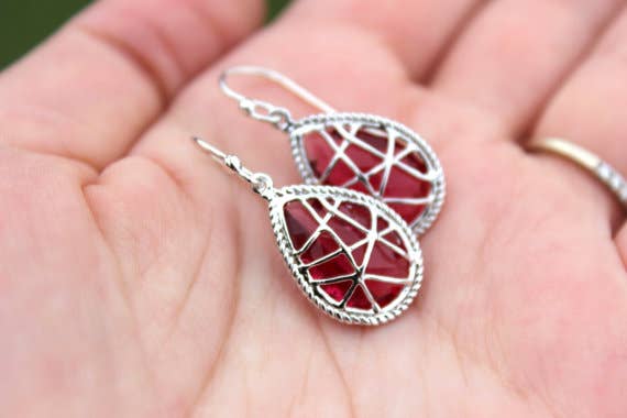 The ruby red teardrop is 14mm by 22mm and has silver plated twisted on it. The earwires are sterling silver. These earrings are so simple and classy. They can be worn for a variety of occasions – wedding, evening events, work, or simply everyday!
