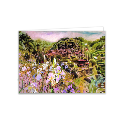 Painterly European village scene with a lush wildflower foreground—an easy bridge between Travel and Botanical.