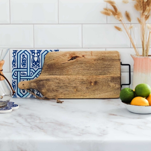 Add a touch of rustic style to your kitchen with our sustainable mango wood chopping boards. Ideal for both prep and presentation, the large board is hard wearing and finished with a handy strap for easy storage._x000D__x000D_Dimensions: 30 x 19 cm (not including handles)_x000D__x000D_All our mango wood products are made entirely by hand using traditional skills handed down from one generation to the next. Mango trees have an incredibly long life, but eventually stop bearing fruit and are replaced by younger trees. As India produces, by far, the most mangos in the world, this results in a huge industry using one of the most sustainable woods known to man._x000D__x000D_Due to the handmade nature of these products each one is unique, but loveliness comes as standard._x000D__x000D_This product has been made by Noah’s Ark, a fantastic member of both the World Fair Trade Organisation (WFTO) and Fair Trade Forum India. With their mission to commit themselves and the producer groups they work with to Fair Trade principles, their goal is to change the lives of grassroots artisans. The organisation works with around 49 talented producer groups, representing approximately 500 artisans collectively working towards the eradication of poverty. Their focus on education and capacity building enables the people they support to become more aware of fair working conditions and the environment, in order to promote the value, cultural heritage and beauty of their handmade products._x000D__x000D_By making a purchase, you are helping to continue the fantastic work of our producers.