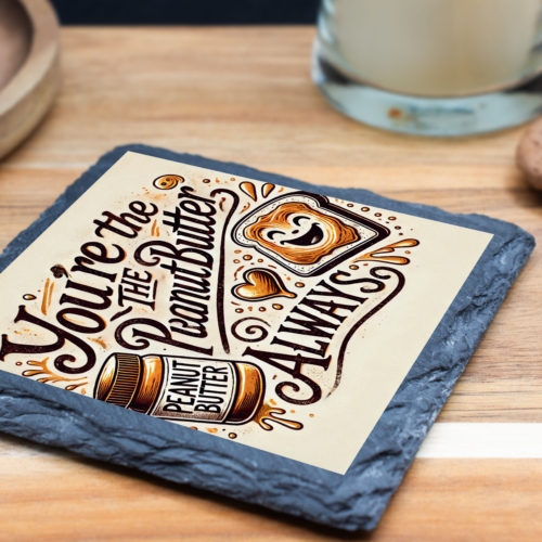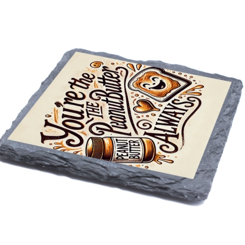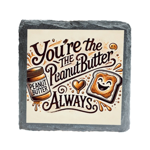 Add charm to your table with this rustic slate coaster featuring a delightful ‘You’re the Peanut Butter to My Jelly’ design. Made from durable slate, this coaster not only protects surfaces from heat and moisture but also adds a touch of whimsy to your decor. Perfect for gifting or personal use, it celebrates the joy of peanut butter with a fun, artistic flair.