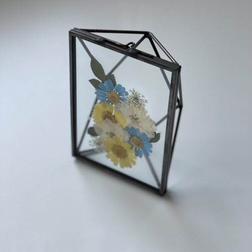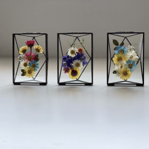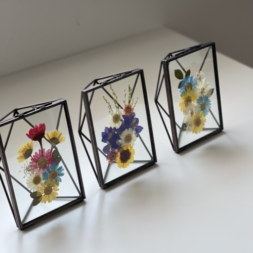 The Rustic suncatchers + Rotating Display is a set of gorgeous real pressed flower arrangements placed in a suncatcher shaped glass frame with rustic metal embellishments.
