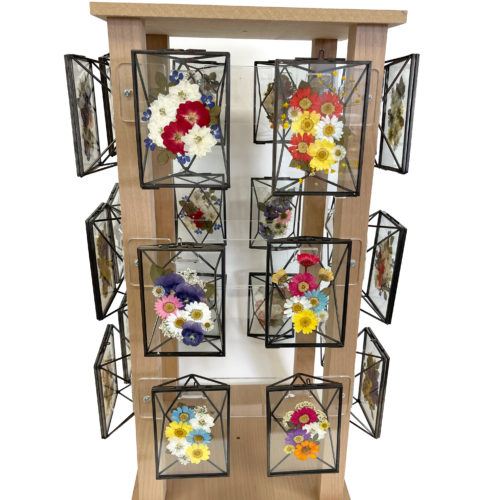 The Rustic suncatchers + Rotating Display is a set of gorgeous real pressed flower arrangements placed in a suncatcher shaped glass frame with rustic metal embellishments.