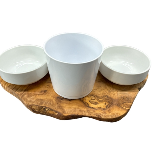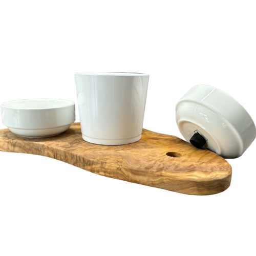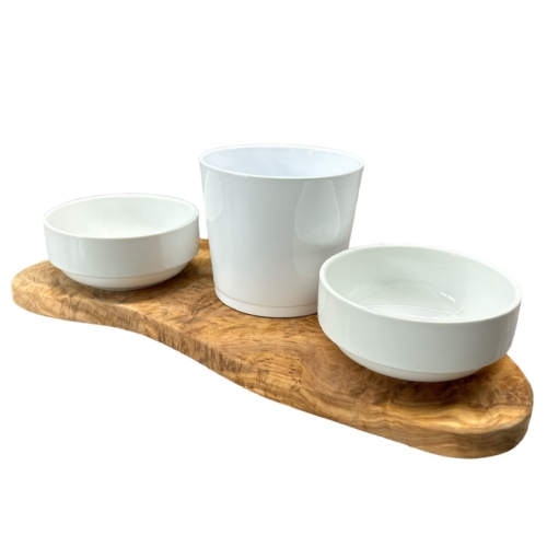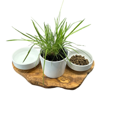 Feeding station for cats. Two 0.4 litre porcelain bowls for dry and wet food are fixed to a base made of solid olive wood. There is also a porcelain pot for cat grass. The bowls can be easily removed from the olive wood base for cleaning. The base is approx. 40 – 45 cm long and approx. 15 cm wide. 100% natural! We have completely dispensed with the use of artificial wood preservatives. The wood has been treated several times with olive oil to provide lasting protection against dirt and moisture. There are anti-slip pads on the underside for a secure stand so that the entire feeding station cannot “wander” when feeding.