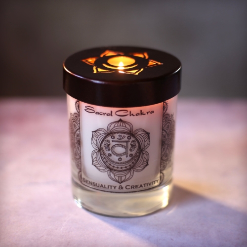 This scented pure soy candle was crafted in accordance with ancient Kundalini wisdom in order to open and stimulate the seven main energy centers (chakras) located in our astral body. This candle is aesthetically pleasing while fulfilling the intention of awakening our sensuality and creativity. Aroma: This aromatherapy candle features Vanilla. Top notes: Crushed Clove, Apple Peel Middle notes: Shredded Coconut, Patchouli Dry notes: Cedarwood, Sandalwood, Vanilla Sugar Intention: Burn this candle to facilitate the opening of the Svadhishthana Chakra, the second energy center that, when functioning properly, awakens one’s sensuality and creativity. This chakra brings us in touch with the element of water. “When the Svadhishthana Chakra is open, we experience vitality, harmony in married life, physical stability, deep communication with our surroundings, security, emotional tranquility, interest, a need for physical contact and caress, a joyful appearance, a balanced liver and gallbladder, and a constant body temperature. A good functioning of this chakra manifests as creativity and enthusiasm in life and great resilience because it stimulates the nervous system. People whose Svadhishthana is functioning in a balanced way will be sure of themselves, have healthy feelings of friendliness and fellowship, and be aware of the futility of accumulating possessions to attain bliss.” From the book Kundalini… the power is in you by Prabhuji. Key features: This candle’s aroma was chosen based on the wisdom of yogic aromatherapy for chakra stimulation. 100% vegetable-based candles made with premium soy wax for a highly clean and non-toxic burn. Scented with a blend of essential oils, following the International Fragrance Association (IFRA) guidelines. The candle comes with guidance for chakra meditation based on the book “Kundalini… the power is in you” by Prabhuji. Pure cotton wick. Hand-poured in USA. The glass jar complies with ASTM safety standards. An ideal candle for spas, yoga studios, meditation rooms, and altars. Attributes: A unique combination of Vanilla Sugar, Cedarwood and Sandalwood accented with succulent Shredded Coconut and Patchouli. A Crushed Clove accord and Apple Peel harmonize this creation to stimulate and awaken the Sacral chakra located in the Pelvic area. Hand-poured in the USA using only high-grade pure soy wax and essential oils, this essential oil candle offers a combination of an elegant design, alluring scent, and pure burning. The lid comes with a design that allows the light to project the carved pattern onto the walls. The geometric pattern of the lid is an ancient yantra, a mystical diagram used in meditation for its occult powers described by Hindu astrology and Tantric texts. Name explanation: The Svadhishthana Chakra is one of seven energy centers in the body. It is the second chakra located just below the navel and associated with the element of water. Why customers love it: We crafted these candles inspired in the wisdom of Kundalini yoga in order to help in chakra meditation. Scented with essential oils, these alluring combinations are custom-tailored to balance the chakras. Each of the seven candles has a corresponding yantra (a mystical symbol) carved into the cover, creating an illuminated pattern of sacred geometry that will give a meditative atmosphere to any room. Made of 100% pure soy wax, these soy candles have a highly clean, non-toxic burn. For a complete experience, meditation instructions are included. Collection: Chakra Natural Soy Candles Collection Description: This is one of the seven fragrances in our Chakra Soy Candles Line. Continued use of these specially designed blends helps strengthen the qualities related to each chakra, such as serenity, creativity, self-confidence, sensitivity, wisdom, concentration, and enlightenment. Packaging: The glass jar displays an Indian motif comprised of an elegant mehendi (henna) design. The bottom is made of heavy crystal. The jar is printed with an elegant pattern made with metallic brown organic paint. It portrays the sacred geometry of each chakra and includes the information needed for chakra meditation practice. After the candle has been fully burned, the candle holder can be repurposed as a drinking glass, or whatever creative idea you have in mind. This metal lid was handmade by a team of Fair Trade artisans in India that are committed to promoting the traditional handicrafts. The lids are carved with sacred designs from the Kundalini yoga tradition. Besides creating a pleasing light pattern, the lid reduces carbon build-up in the jar and helps the candle burn evenly. It can also be painted and hung as a decoration for a room or altar. Manufacturing process: This candle was designed based on the Kundalini wisdom presented in Prabhuji’s book. The glass container was selected for its compliance to ASTM safety standards. The candle is hand-poured in USA using pure vegetable soy wax. The oils were tested for their benefits, and the formula was carefully tuned until it reached the perfect balance of hot and cold throw. Two years in the making, the team of designers at Prabhuji’s Gifts worked hard to create these high quality candles aimed at bringing yoga lovers the perfect candle for inducing a meditative experience. Certifications: Gold-level Green America Certified Business Certified Vegan Sustainability: The soy wax used in this candle is environmentally friendly. Candles have no artificial colors. The lid is handmade by artists according to the traditional Indian method, producing minimal waste. This product’s package is made from 100% recyclable paper, and shipping materials are made from recycled and reused packaging products. The jar can be used as a drinking glass after the candle is fully burned. Charitable Cause: Prabhuji’s Gifts supports Prabhuji Mission, a New York-based nonprofit organization that is home to a spiritual community. The mission runs humanitarian projec