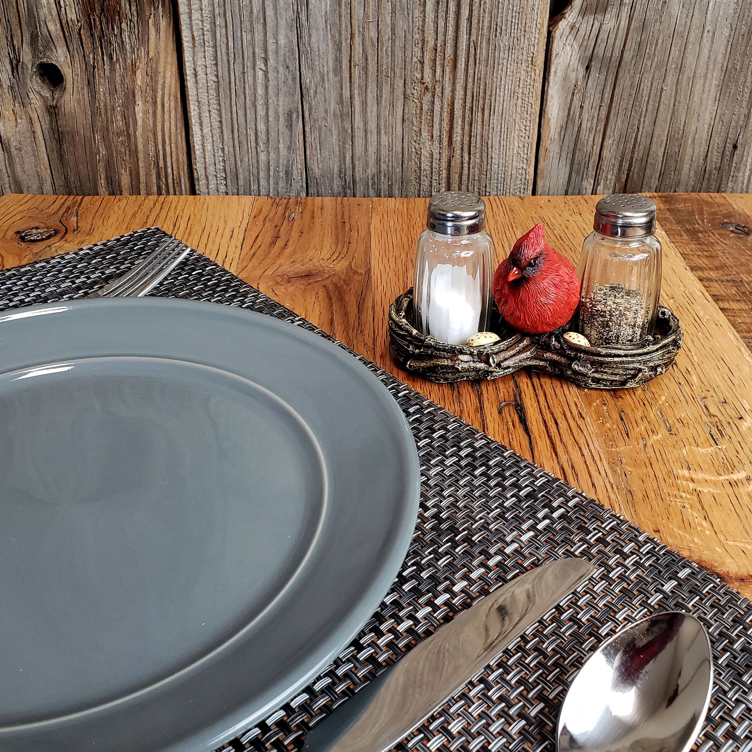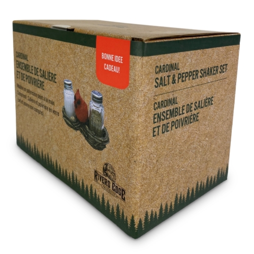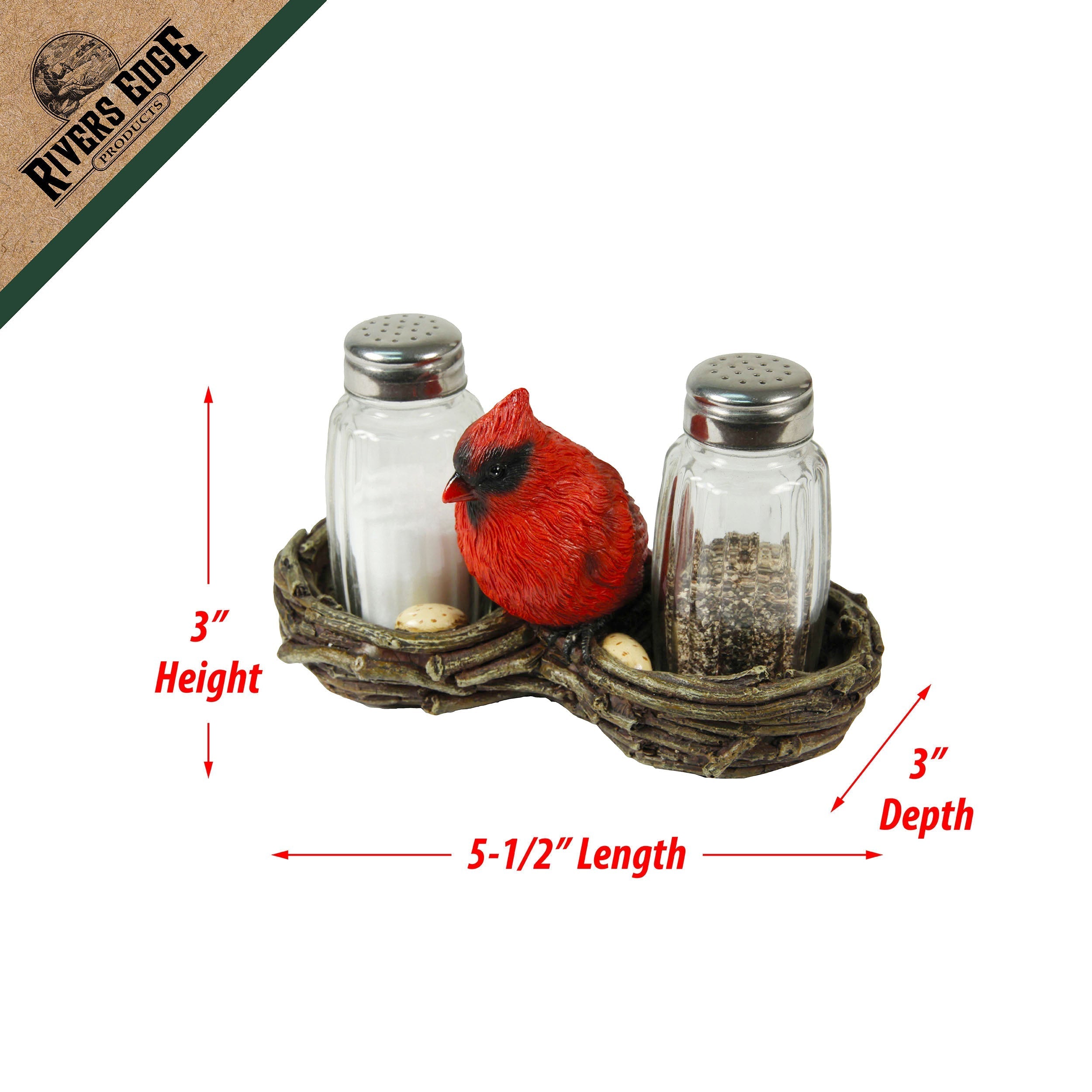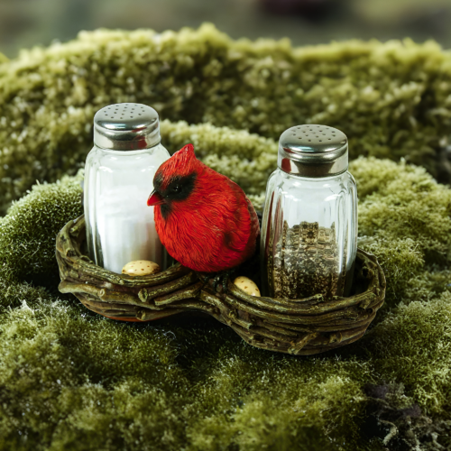 This cardinal nest salt and pepper shaker set from Rivers Edge Products will be a welcome addition to your dining room table. These glass salt and pepper shakers fit nicely into the base featuring two cardinal nests. The base is hand-painted poly resin and is highly detailed with a red, male cardinal sitting in between the shakers. The shakers are made of clear glass so you’ll never mistake salt for pepper when you season your food. The Cardinal Nest salt and pepper shakers will allow you to season your meal with style.