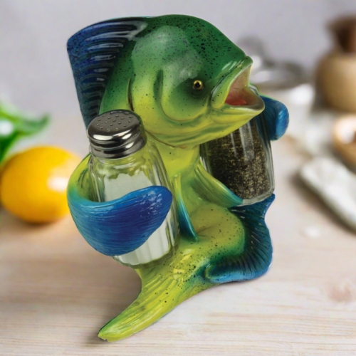 This mahi mahi salt and pepper shaker set from Rivers Edge Products will be a welcome addition to your dining room table. The glass salt and pepper shakers fit nicely into the fins of a cartoonish, openmouthed mahi mahi. The mahi mahi is hand-painted poly resin and is highly detailed and colorful. The shakers are made of clear glass so you’ll never mistake salt for pepper when you season your food. The Mahi Mahi salt and pepper shakers will allow you to season your meal with style.