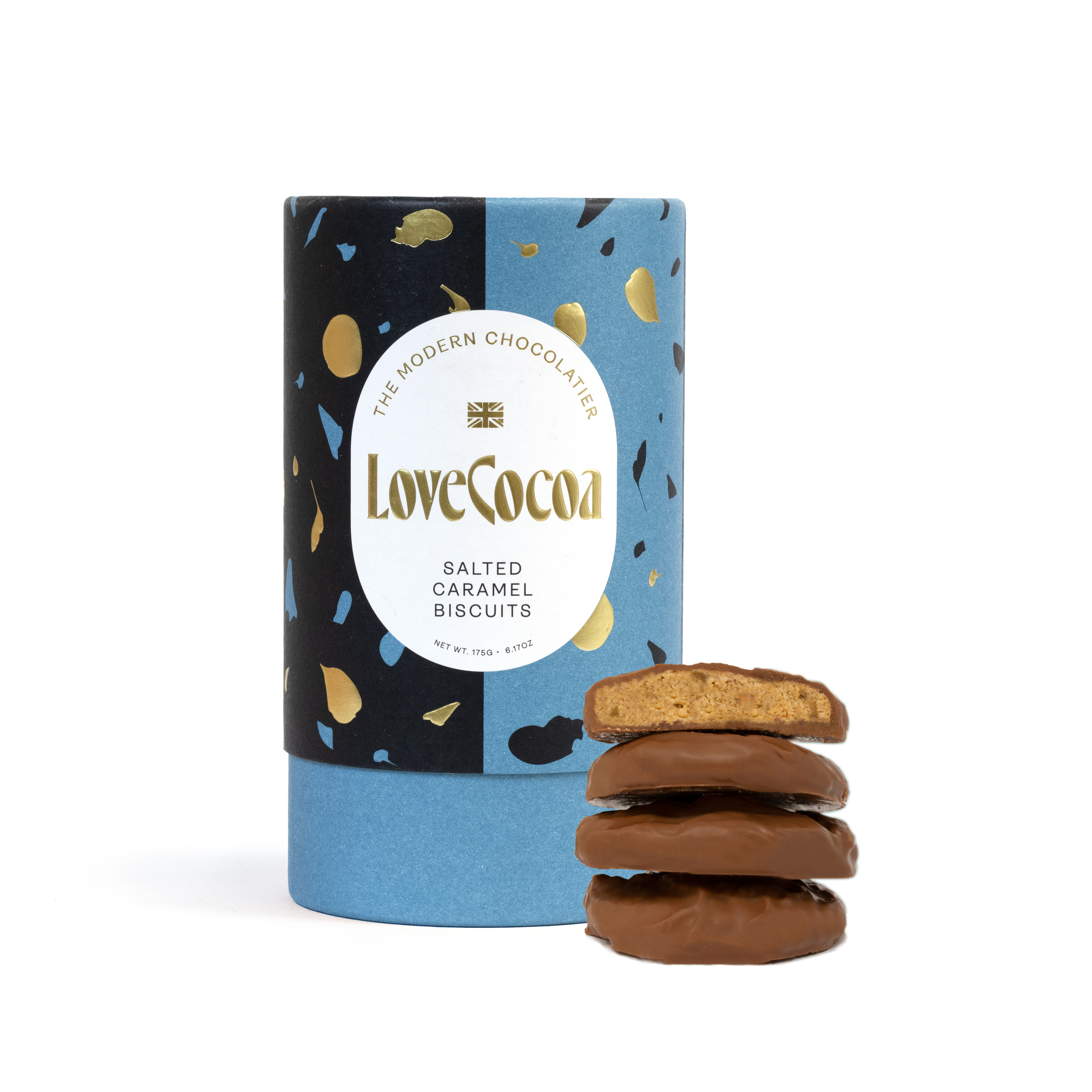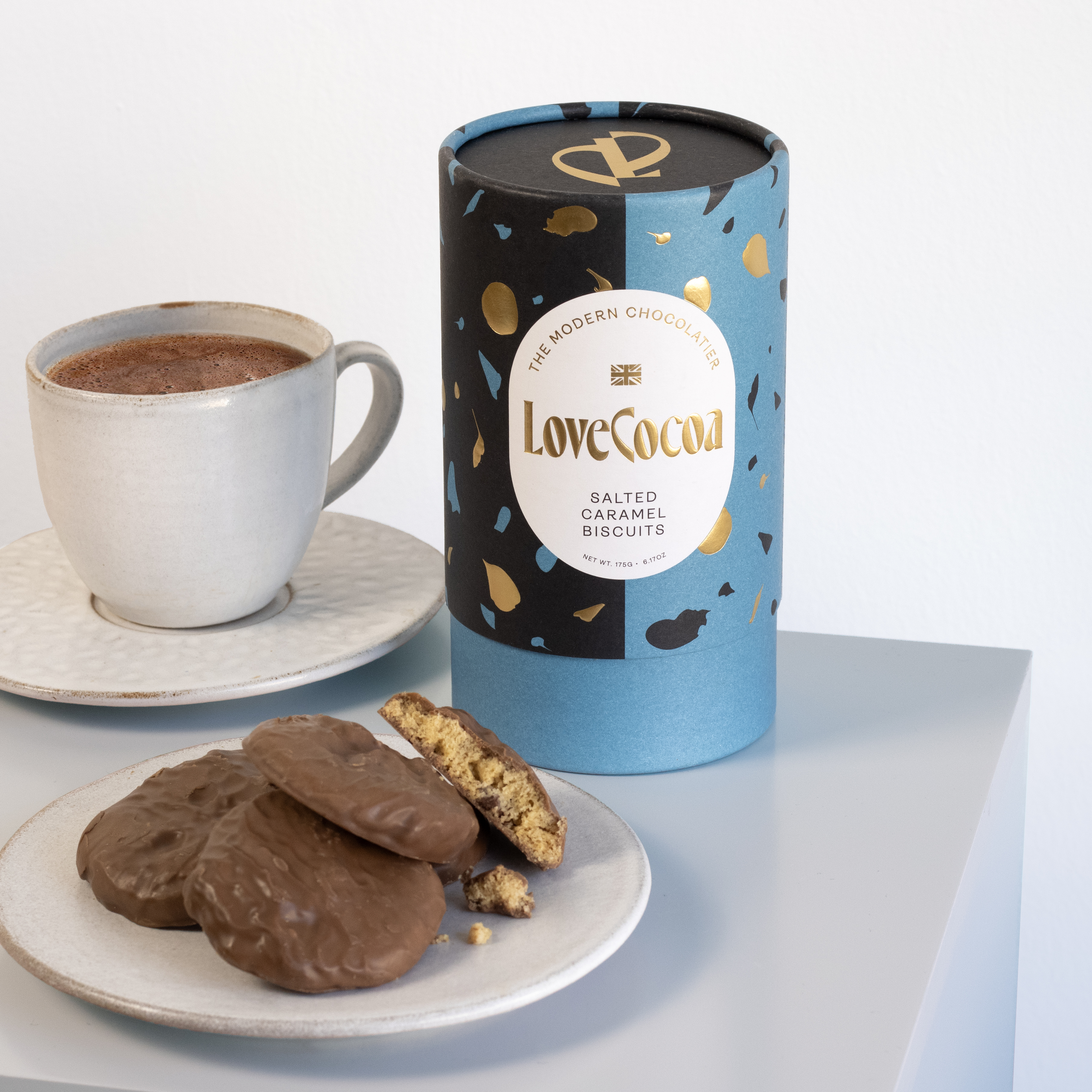 Rich, buttery biscuits with salted caramel chunks enrobed in a velvety chocolate shell. Perfect for dipping into your warming mug of Love Cocoa hot chocolate!