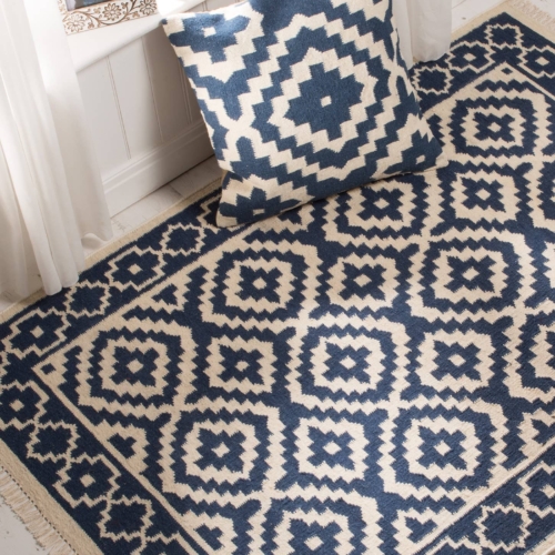 This traditionally made handloomed deep indigo kilim rug with a cream base is inspired by the bazaars of the ancient Silk Road city of Samarkand. Contemporary enough for a loft apartment and yet also perfect for a house in the country, this rug is part of one of our best-selling ranges. The high wool content allows vibrancy and depth of colour, also allowing greater detail to be incorporated into the design.75 x 240cm80% Wool & 20% CottonBrush or vacuum to remove loose dirt and dust. Blot spills immediately with a dry cloth. Spot or dry clean to remove stains.Our supplier is a long term member of GoodWeave, ensuring no child labour is employed in the entire supply chain. The company specialises in hand loom rugs, many of which are made from recycled sources. They provide the skilled weavers, many of whom are women, with well-paid work and much of the weaving is carried out in the weavers own homes.