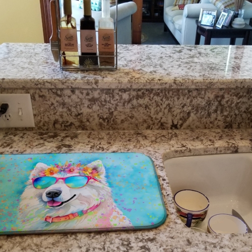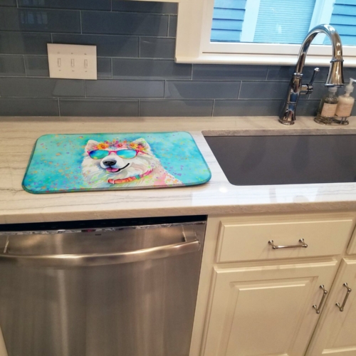 Dish Drying Mat featuring breed specific Samoyed artwork. Say goodbye to messy countertops and soggy dish towels with our innovative dish drying mat. Our high-quality dish drying pad is designed to keep your countertops dry while offering a stylish and efficient solution. Whether you’re air drying dishes, glasses, stemware, silverware, pots, pans, bottles, or even fruits and vegetables, our dish mat is the perfect choice. The 14 inches x 22 inches size fits most counters and dish drying racks, and the non-slip design ensures stability. Made with water-absorbent polyester and a polyurethane foam insert, our dish drying mat is not only functional but also durable. It’s machine washable and printed in the USA for long-lasting use. The beautiful artwork adds flair to your kitchen decor, making it a perfect housewarming gift or present for any occasion. Upgrade your kitchen experience with our absorbent and versatile dish drying mat.