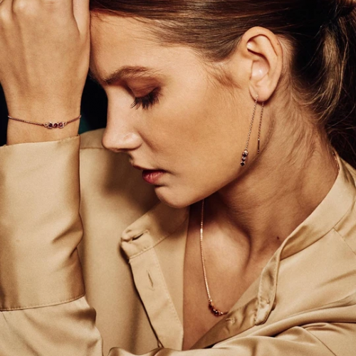 This dainty piece delivers the ultimate minimalistic chic with 18 ct rose gold vermeil and hand-picked natural gemstones. Stack with bracelets in same silhouette or contrast the daintiness with a chunky watch. Or try it with the matching necklaces and earrings.