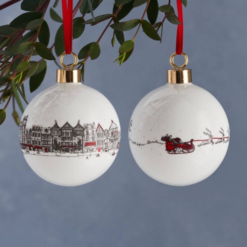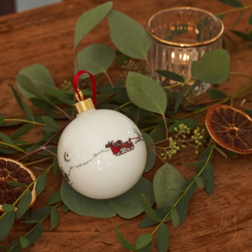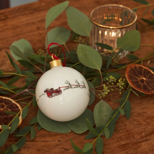 The beautifully hand illustrated Santa’s Sleigh collection highlights a magical and nostalgic view of Christmas. The traditional festive legend sees reindeer pulling a Father Christmas in a sleigh through the night sky to deliver gifts to children on Christmas Eve. As they fly silently over a snowy picturesque English town people below go about their last minute preparations unaware of the magic happening above them. These hand decorated fine bone china baubles by Victoria Eggs is sure to add a whimsical charm to your Christmas tree.- Hand decorated in Britain. Fine bone china. Red grosgrain ribbon.Presentation boxes for baubles are available separately. Key words:Small business, baking, British, made in Britain, Britain, Christmas, Christmas dinner, cooking, Cosy, English, Father Christmas, gift, hand decorated, handmade, homeware, illustrated, kitchen, luxury, magic, red, UK, UK made