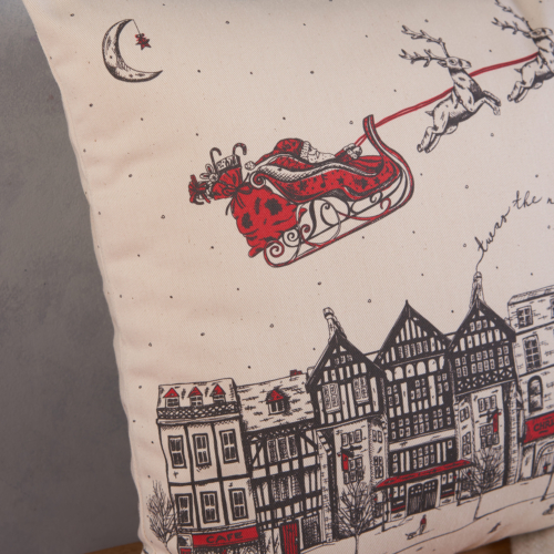 The beautifully hand illustrated Santa’s Sleigh Cushion Cover highlights a magical and nostalgic view of Christmas. The traditional festive legend sees reindeer pulling Father Christmas in a sleigh over a snowy picturesque English town.- Handmade in Britain, screen printed onto 100% cotton. – Dimensions: approx 40cm x 40 cm.- Washing: Machine washable, max 40 degrees celsius.- Zip on one side to add your own inner. Inner not included.International shipping available.