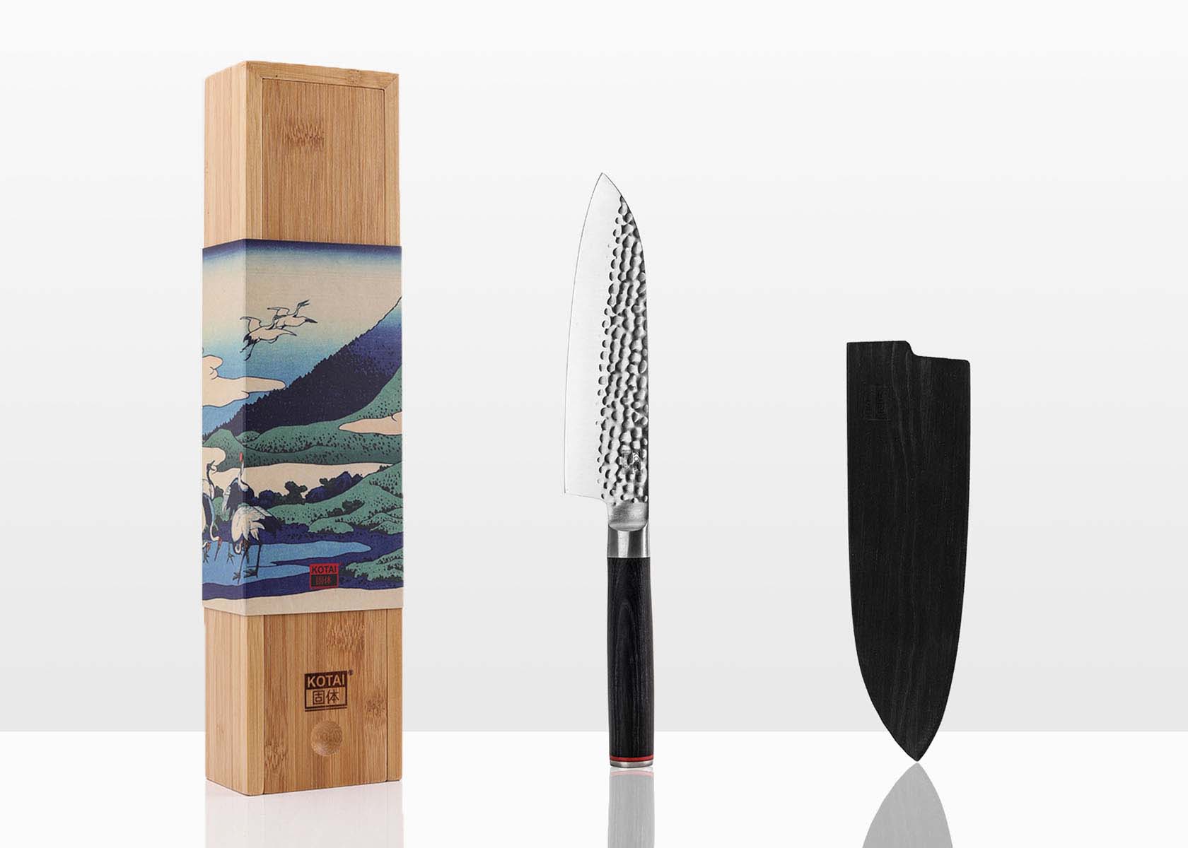 Forged with Japanese 440C high-carbon stainless steel, the KOTAI Santoku’s blade will stay sharp up to 10 times longer than other knives. 440C combines a high carbon content for hardness and edge retention with the optimal amount of chromium for corrosion resistance.