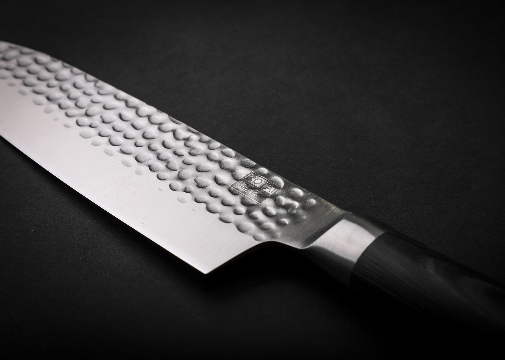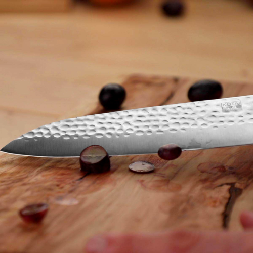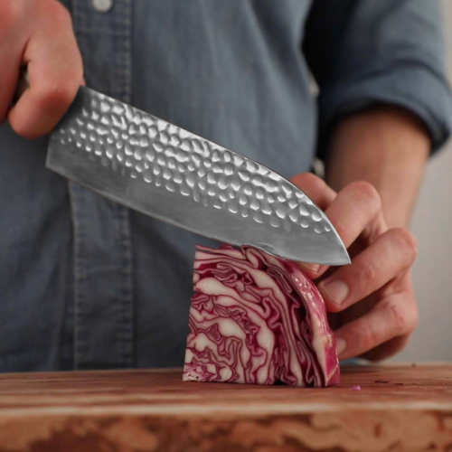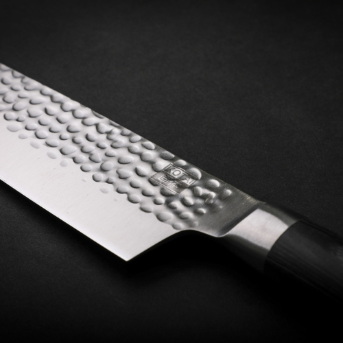 Besides its aesthetic appeal, the “Tsuchime” (槌目) (hammered) pattern creates tiny pockets of air between the blade and the food being cut. This ancestral Japanese method reduces drag, thus preventing food from sticking to the blade.
