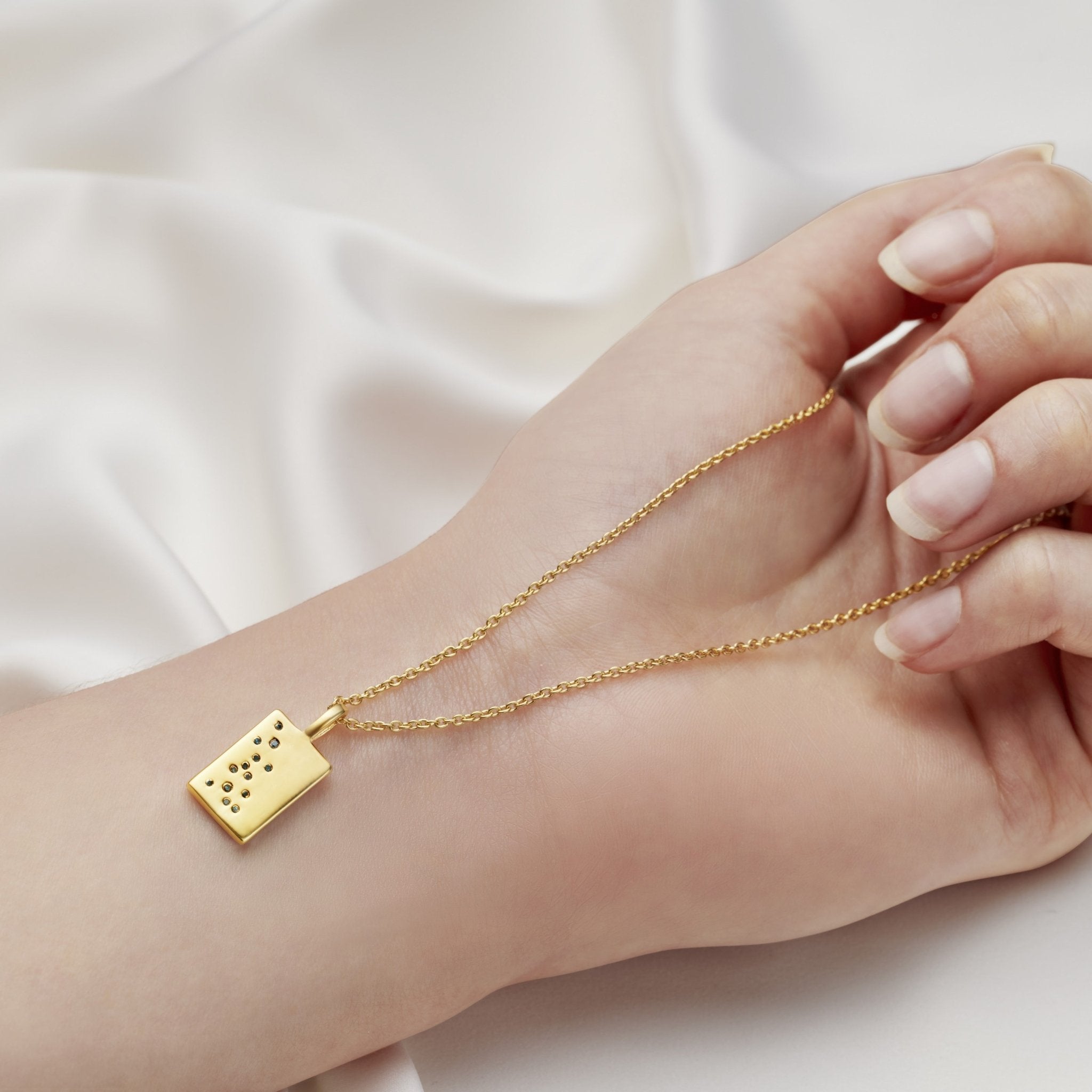 A gold vermeil tag pendant featuring a sprinkling of blue diamonds. Hanging from an adjustable chain you can layer with other necklaces for a curated look. Matching blue diamond band available here. A luxury piece for any occasion, presented in an elegant black gift box complete with our logo in gold foil, this is the ideal gift for a loved one, or for yourself. Pendant 15x10mm Real treated diamonds Chain 40cm with a 5cm extension For more information on caring for your gold vermeil jewellery please see the Jewellery Care section of our website. Please review our shipping information here.