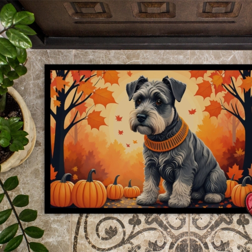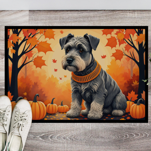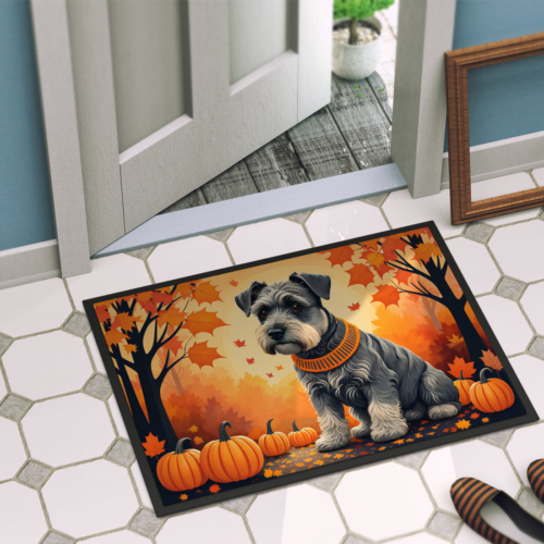 Doormat featuring breed specific Schnauzer artwork. Welcome your guests in style with our Artwork Door Mat, designed to withstand almost any weather condition. This mat, measuring approximately 24 by 36 inches, is held together by durable black binding tape. Its top layer, composed of polyester felt, is dyed with the eye-catching image you see on the mat. A few layers below provide the mat with stability, while its rubber bottom is stamped to help prevent slipping and ensures safety. Our mat works wonderfully as both an indoor or outdoor door mat. For cleaning, simply hose it off with water or use a power washer – no need for any cleaner that produces suds. Avoid scrubbing with a brush, instead, opt for the vacuum on floor setting. Designed manufactured and printed in the USA, this mat is a perfect addition to your porch, outdoor kitchen, entryway, or any indoor space. Its unique design makes it a charming decorative rug that greets your guests and adds a stylish touch to your home decor.