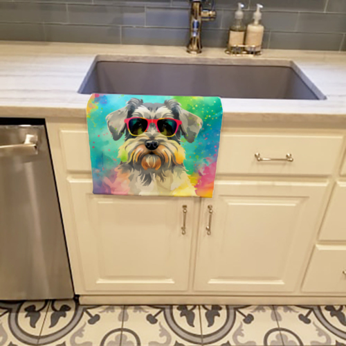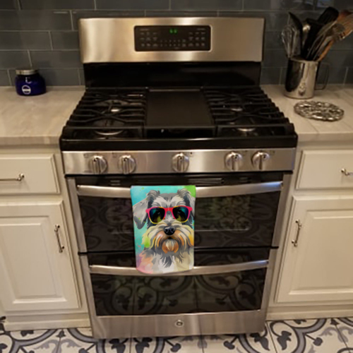 Kitchen Towel featuring breed specific Schnauzer artwork. Experience the perfect blend of aesthetic appeal and functional excellence with our Plush Velour Kitchen Towels. These are not your ordinary decorative kitchen towels that gather dust. Instead, they are designed to be as practical as they are stylish. The front layer of our towel is constructed from a minky plush polyester, known for its durability and color retention. Unlike conventional kitchen towels, the artwork on our towels is dyed directly into the fabric, ensuring vibrant colors that last. Polish your glassware to a brilliant sparkle using the plush front side of the towel. Flip to the back, crafted from 100% cotton terry loop, to exploit its exceptional absorbency for drying dishes or wiping down counters. Our kitchen towels redefine the concept of functional art, offering lasting quality that maintains the towel’s shape over time. Measuring 15 inches by 25 inches and weighing 2.3 lbs per dozen, these towels deliver an overwhelming sensory experience with their soft, plush, and smooth texture. The edges are meticulously finished with binding, enhancing their durability and visual appeal. For your convenience, these towels are machine washable and can be dried on low heat. After the first wash, the top fabric becomes even softer and fluffier, eliminating the need for ironing. Treat your kitchen to the luxury and functionality it deserves with our plush velour kitchen towels.