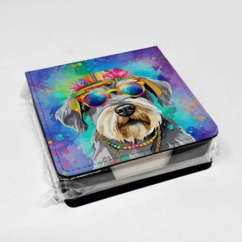 PU Leather Note Paper Holder featuring breed specific Schnauzer artwork. Elevate your workspace with this PU Leather Note Paper Holder, crafted to resemble luxurious leather without the use of animal products. Made from durable synthetic PU leather, it offers both a premium look and eco-friendly appeal. This note holder, compactly sized at 4.25 x 4.25 x 1.25 inches, includes about 160 sheets of 3.75 x 3.75-inch note paper—ideal for quick notes and reminders. An exclusive artist-designed cover makes each holder uniquely vibrant, adding a splash of color and personality to any desk or office. The discrete design keeps note paper hidden, maintaining a neat and organized workspace. Perfect as a gift or for personal use, this stylish holder is refillable with standard paper, ensuring long-lasting utility. A must-have for anyone seeking a sophisticated, artful touch to their workspace while supporting animal-friendly products. Add style, organization, and creativity to your everyday routine with this elegant note paper holder.