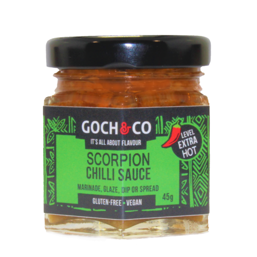 Scorpion Chilli Sauce A fiery sauce with fruity flavours and zesty overtones made from Trinidad Moruga Scorpion chilli peppers. It is great when eaten in tiny amounts to add extra heat and flavour to food. Great as a marinade and condiment, add to dips, curries, stir-fries, and spicy appetisers. You can add flavour to burgers, fajitas, and snacks. The fiery aromas give a pleasant rush of endorphins, and on taste, a combination of immense heat and bursts of tender fruity flavours. Gluten-free. No GM. No GMS. Vegetarian. Vegan. No Artificial Additives. No Added Sugars. Recyclable pack. Made in Wales, UK. Heat Level: Very Hot Servings per 100g: 20 Each Serving: 5g Ingredients: Chilli Peppers (47%), Shallots, Olive Oil, White Vinegar, Herbs & Spices, Salt. Allergen Advice: For Allergens, including cereals containing gluten, see ingredients in BOLD. Produced in a facility that handles cereals and nuts. Nutrition: Typical Values 100g contains: Energy 335Kj/81Kcal Fat 5.7g of which Saturates 0.8g Carbohydrates 4.3g of which Sugars 3.2g Fibre 1.2g Protein 1.8g Salt 0.5g Country of origin: Wales, United Kingdom. Storage: Store in a cool and dry place.