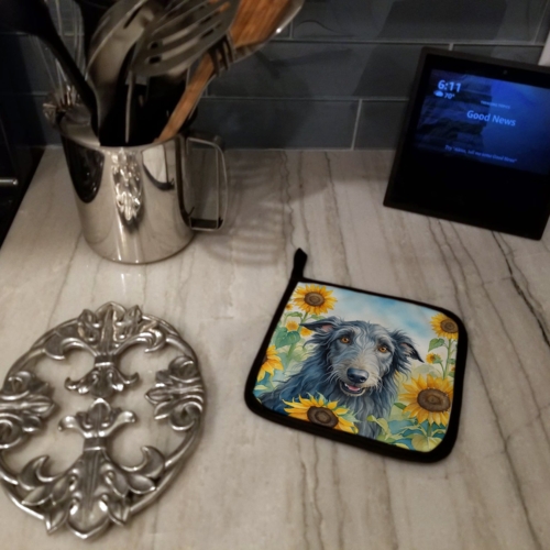 Pair of Pot Holders featuring breed specific Scottish Deerhound artwork. A Pair of Pot Holders to match your kitchen decor. Made in the USA these are thick and functional. Full color artwork decorates the front polyester fabric of the hot pad and accented by a black trim. Use these at as a trivet for your Thanksgiving or Christmas tablescape. Filled with insulated fabric and quilted for durability. These colorful pot holders will make a great gift for your favorite home cook or executive chef. Each pot holder measures approximately 7 1/2 inches by 7 1/2 inches. A hanging tab is included.