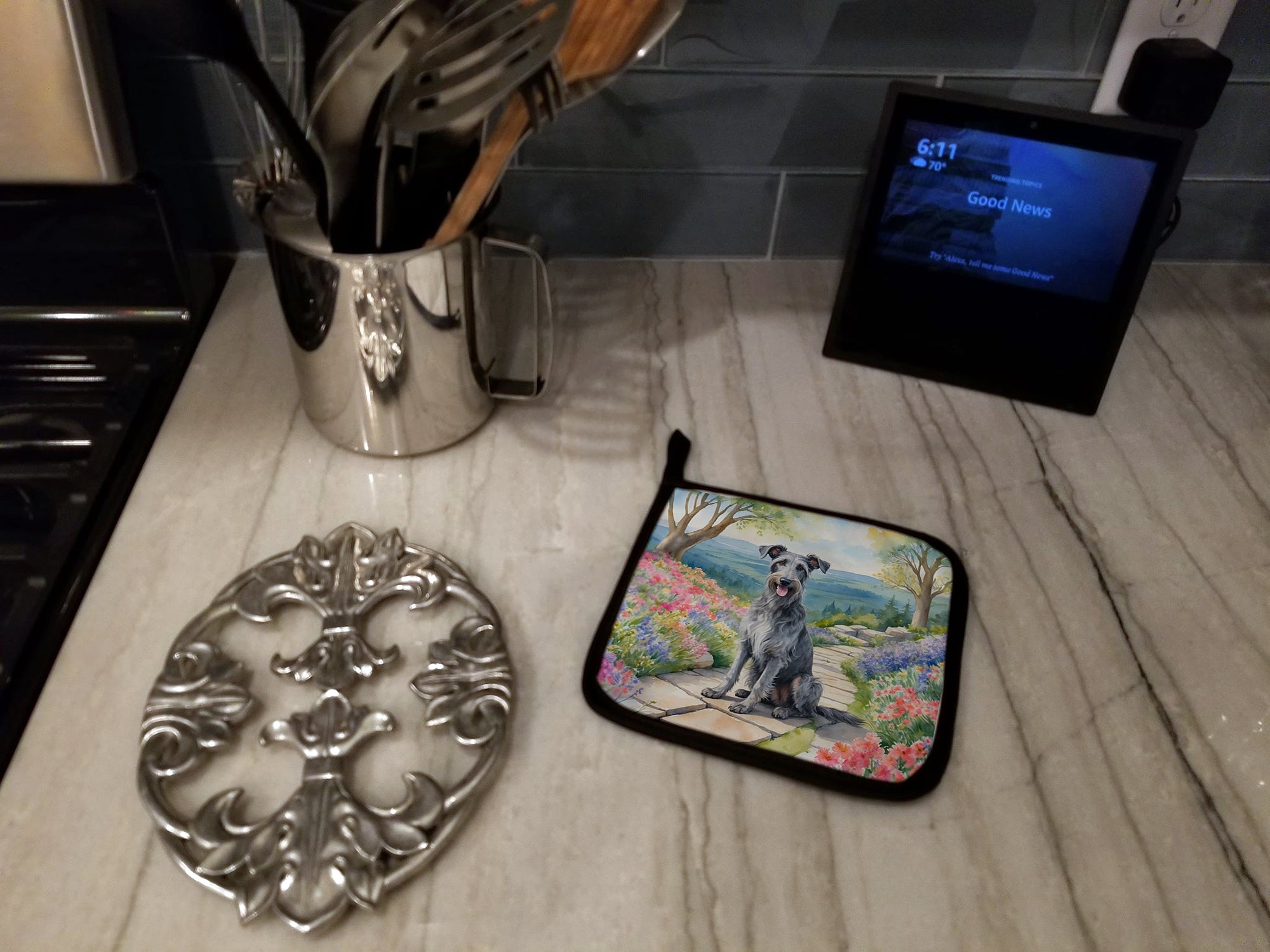 Pair of Pot Holders featuring breed specific Scottish Deerhound artwork. A Pair of Pot Holders to match your kitchen decor. Made in the USA these are thick and functional. Full color artwork decorates the front polyester fabric of the hot pad and accented by a black trim. Use these at as a trivet for your Thanksgiving or Christmas tablescape. Filled with insulated fabric and quilted for durability. These colorful pot holders will make a great gift for your favorite home cook or executive chef. Each pot holder measures approximately 7 1/2 inches by 7 1/2 inches. A hanging tab is included.