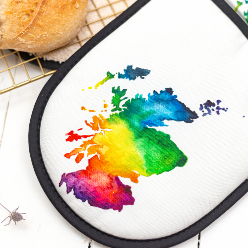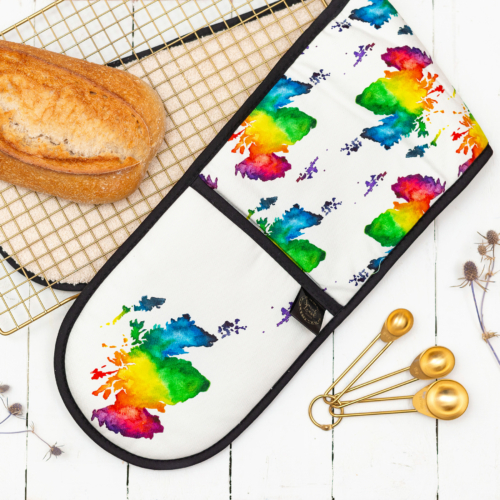 Discover Scotland with these eye-catching oven gloves featuring many of the well-known isles as well as some of Scotland’s harder to reach treasures. Scotland’s coastline is highlighted in a beautiful rainbow colour gradient, painted by hand in watercolour..