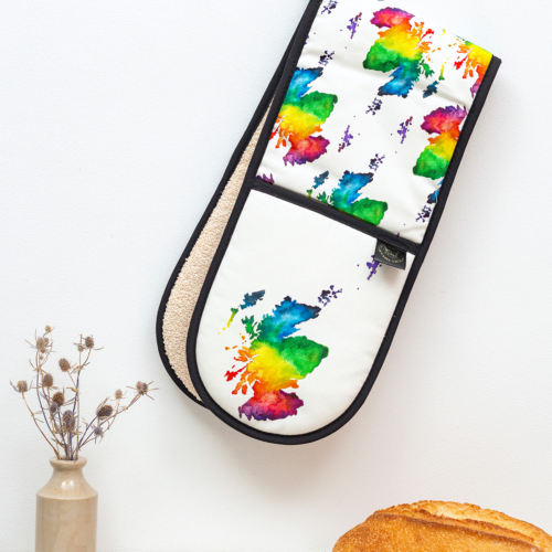 Discover Scotland with these eye-catching oven gloves featuring many of the well-known isles as well as some of Scotland’s harder to reach treasures. Scotland’s coastline is highlighted in a beautiful rainbow colour gradient, painted by hand in watercolour..