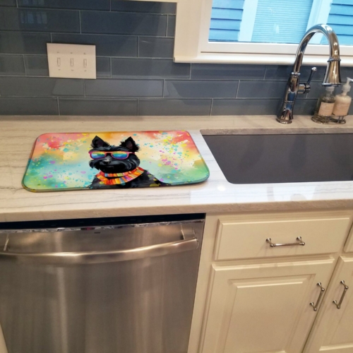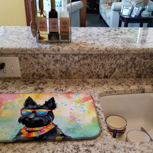 Dish Drying Mat featuring breed specific Scottish Terrier artwork. Say goodbye to messy countertops and soggy dish towels with our innovative dish drying mat. Our high-quality dish drying pad is designed to keep your countertops dry while offering a stylish and efficient solution. Whether you’re air drying dishes, glasses, stemware, silverware, pots, pans, bottles, or even fruits and vegetables, our dish mat is the perfect choice. The 14 inches x 22 inches size fits most counters and dish drying racks, and the non-slip design ensures stability. Made with water-absorbent polyester and a polyurethane foam insert, our dish drying mat is not only functional but also durable. It’s machine washable and printed in the USA for long-lasting use. The beautiful artwork adds flair to your kitchen decor, making it a perfect housewarming gift or present for any occasion. Upgrade your kitchen experience with our absorbent and versatile dish drying mat.