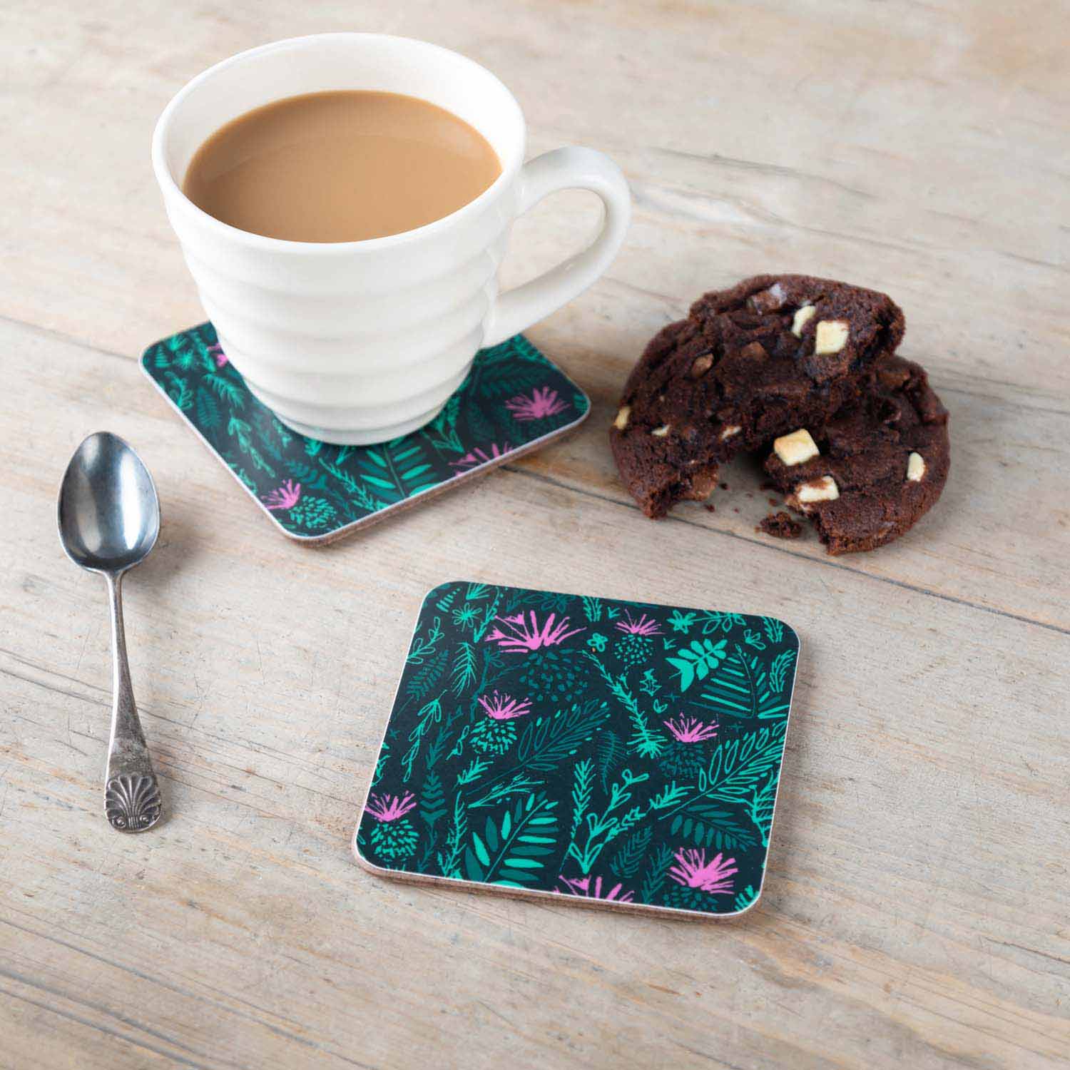 Printed in greens and pinks this nature inspired coaster with wild thistle flowers design will protect your table cloth from unwanted cup ring mark stains. Measuring 9.8cm x 9.8cm, the coaster is made from eucalyptus board with matte laminate finish.The base of the coaster is made of cork.