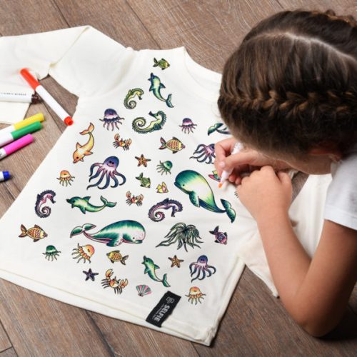 The lightweight jersey blend top features a unique sea creatures colour in design, ready for your little ones to get creative with. The fabric pens use high-quality UV ink which can be air cured for 24 hours or ironed by a parent. The colours will not fade and can be worn time and time again.