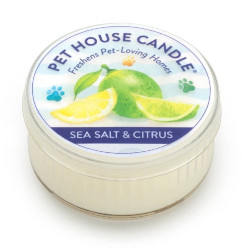 Sea Salt & Citrus evokes the feeling of relaxing oceanside with a refreshing citrus beverage. Sea Salt & Citrus is a mixture of sea salt crystals, sea moss, lemon water, bergamot and rosewater. ***All 1.5 oz. candles ship in cases of 12. You can mix a case with up to two fragrances (six units per fragrance).***One Fur All Products may not be sold on Amazon, Ebay or other 3rd party websites.Get rid of odors and freshen your home with a Pet House Mini Candle from One Fur All! Designed and formulated to neutralize odors in the smaller spaces of your home, these candles are a must-have for both dog and cat owners. While most candles simply mask smells, our blend includes an odor neutralizer that leaves your home clean, welcoming, and undeniably fresh. Using top quality fragrances, we developed over 20 different scents that will fill the room with a calming aroma thats never overwhelming! Thanks to natural plant-based wax and a cotton wick, our mini candles last for up to 12 hours!