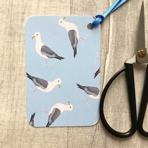 Seagull gift tag Each tag is made from 300gsm card which is Acid free and Lignin free, the size of the tag is 6.5cm x 10cm roughly (as its handmade), it is non coated so easy to write on. The ribbon is dependent on what I have available at the time, but will colour match the tag