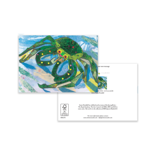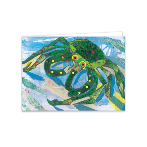 Playful coastal collage crab in vibrant greens and sea blues; brilliant colour pop for spinner racks and summer windows.
