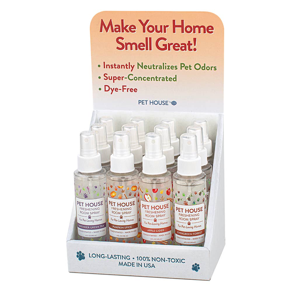 Displays come with 3 each of Pumpkin Spice, Apple Cider, Lavender Green Tea, and Evergreen Forest. These are 4oz spray bottles. ***One Fur All Products may not be sold on Amazon, Ebay or other 3rd party websites.Get rid of odors and freshen your home with a Pet House Freshening Room Spray from One Fur All! Designed and formulated to neutralize odors, they are a must-have for both dog and cat owners. While most sprays simply mask smells, our blend includes an odor neutralizer that leaves your home clean, welcoming, and undeniably fresh.Our new seasonal room spray display is now available just in time for Autumn. Your customers will enjoy these top-selling seasonal fragrances in their homes and gift them to their pet-loving friends and family.At One Fur All, we know that a happy, healthy home starts with a clean environment.
