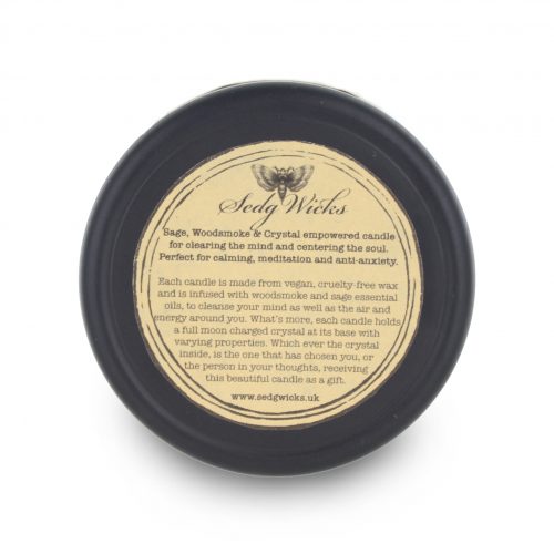 Each candle is handmade from vegan, cruelty-free wax and is infused with sage essential oils as well as a hint of woodsmoke, to cleanse your mind as well as the air and energy around you. What’s more, each candle holds a full moon charged crystal at its base with varying properties. Which ever the crystal inside, is the one that has chosen you, or the person in your thoughts, receiving this beautiful candle as a gift.