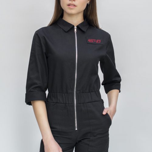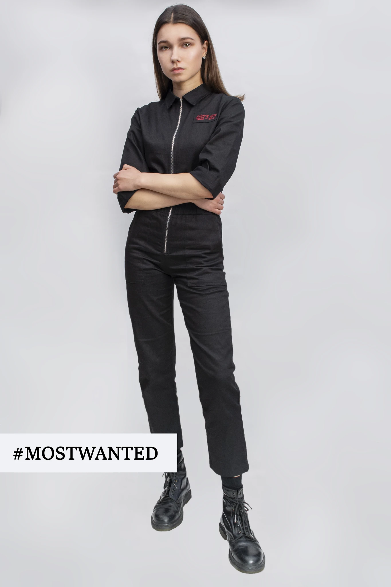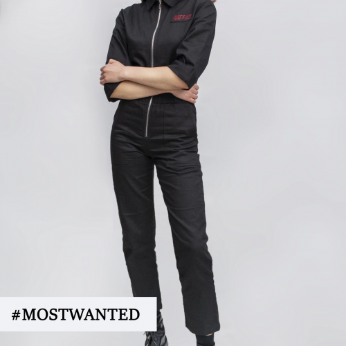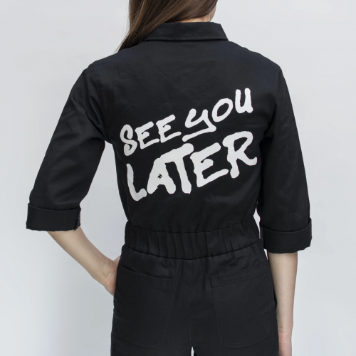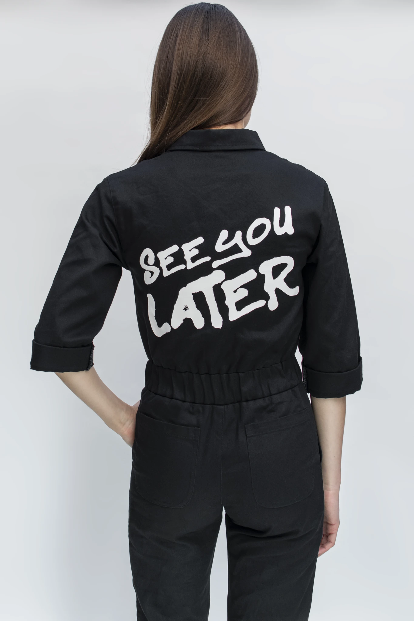 This black denim utility zip boiler suit is the latest fashionable hero piece to add to your wardrobe. Logo patch at the front, “See You Later” Graphic at the back,100% Cotton, black zip on the front and an elasticated waistband, dress it up with heels or grunge it down with some chunky boots. Machine wash.