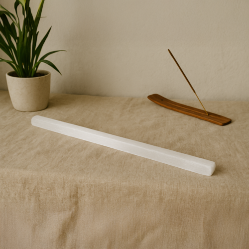 Selenite Wand, Flat Stick carved from genuine selenite with a smooth polished finish. Ideal for crystal shops, wellness suppliers and holistic retailers focused on energy work, cleansing and spiritual rituals.