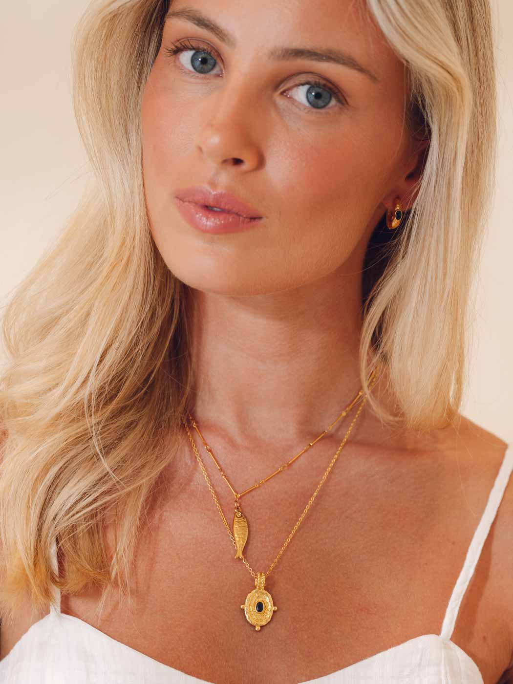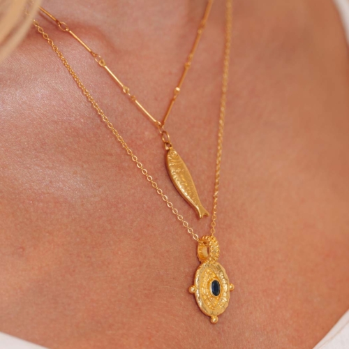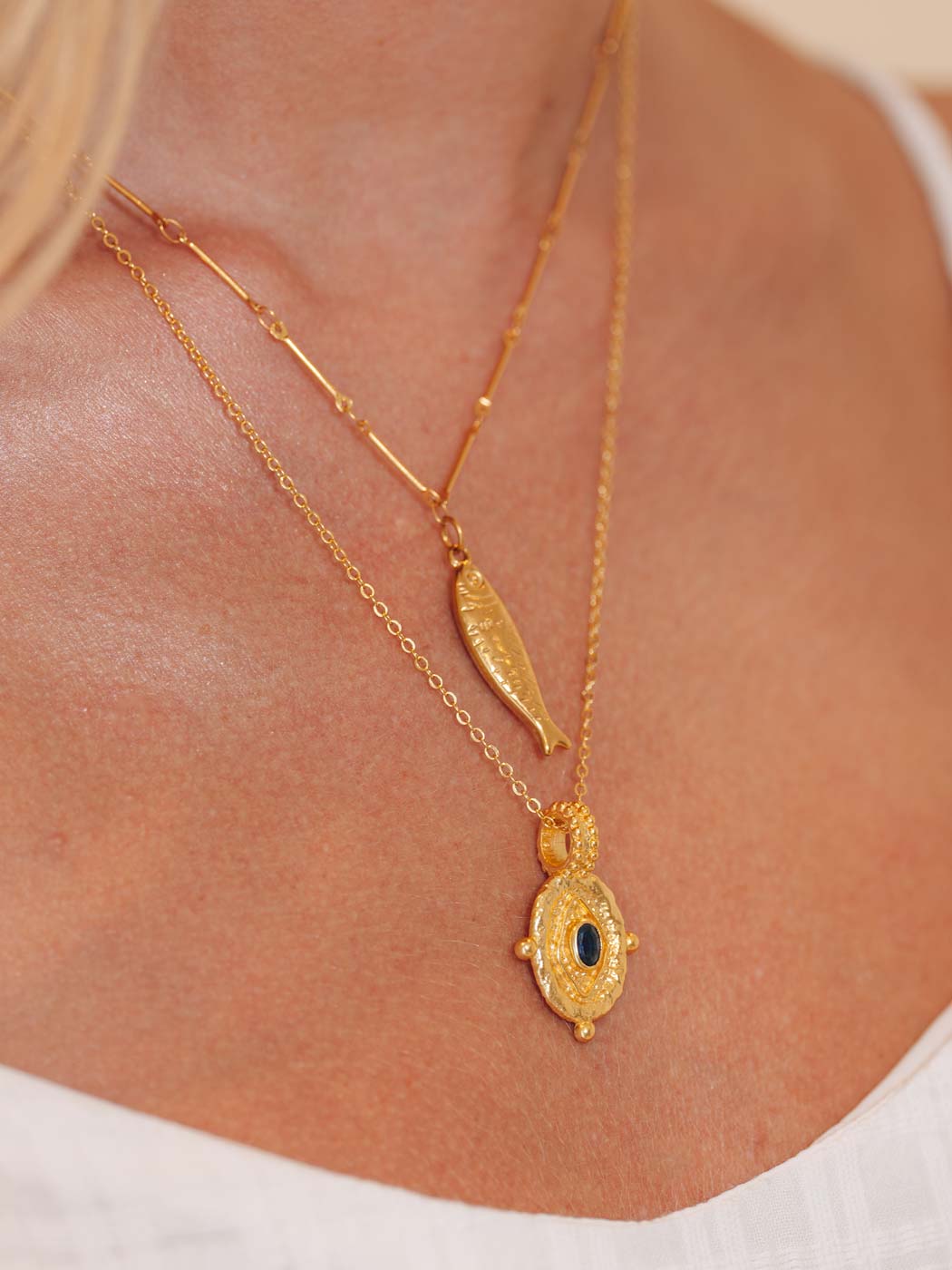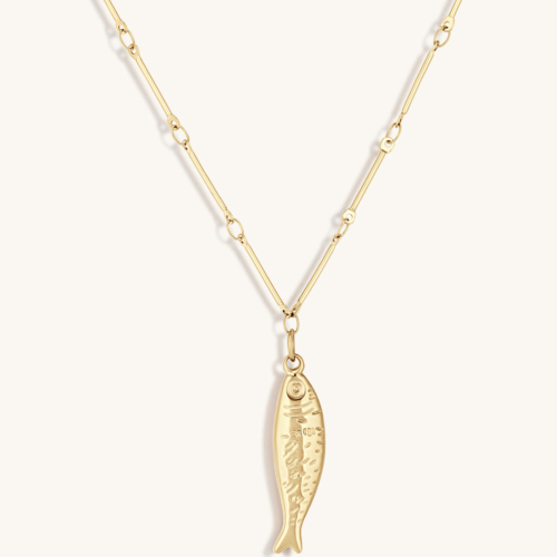 Meet your new lucky charm. Our gold fish pendant brings a touch of beach-side soul to your look, no matter the weather. Playful and timeless, paired with a unique chain and shiny gold finish, make it the perfect day to night piece. It slips effortlessly into your current stack, or shines solo. Plated using a new vacuum technique, making it tarnish-proof, life-proof and durable. MATERIALS : 18K gold plated sterling silver SIZING : 16″ chain, 3 cm pendant MEANING : Fish – abundance, spiritual growth and transformation