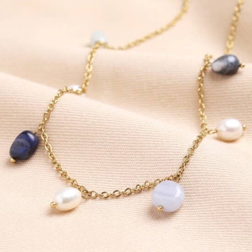 A charm necklace in 14ct gold platingWith a variation of blue-toned stonesFinished with freshwater pearl dropsDimensions: length 40.5cm (16″) with a 5cm extenderMade from: 14ct gold plated stainless steel, freshwater pearls, semi-precious stoneProduct Code: 77980