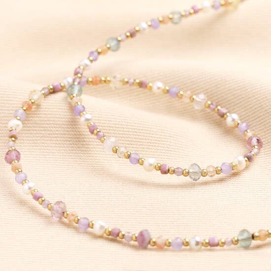 Semi Precious Pearl Purple and Blue Beaded Necklace in Gold