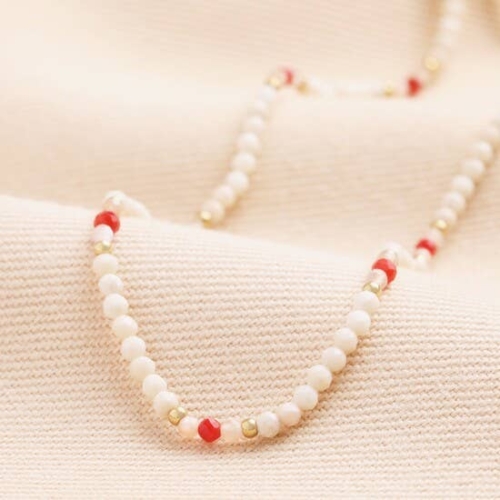 Featuring gold plated, red and white beadingComplete with a pulley clasp and lobster claspPerfect for summer themed jewellery collections for teenagersDimensions: length 36cm with a 9cm extenderMade from: 14ct gold plated stainless steel, semi-precious stone