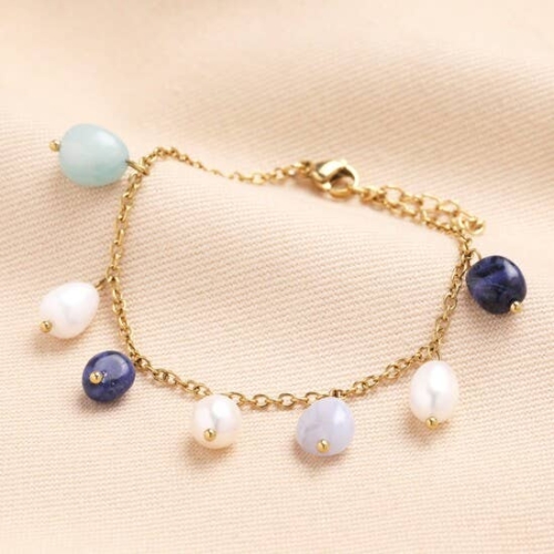 A charm bracelet in 14ct gold platingWith a variation of blue-toned stonesFinished with freshwater pearl dropsPerfect for a waterproof or summer-themed jewellery collectionDimensions: inner circumference 17.1cm with a 5cm extenderMade from: 14ct gold plated stainless steel, freshwater pearls, semi-precious stone