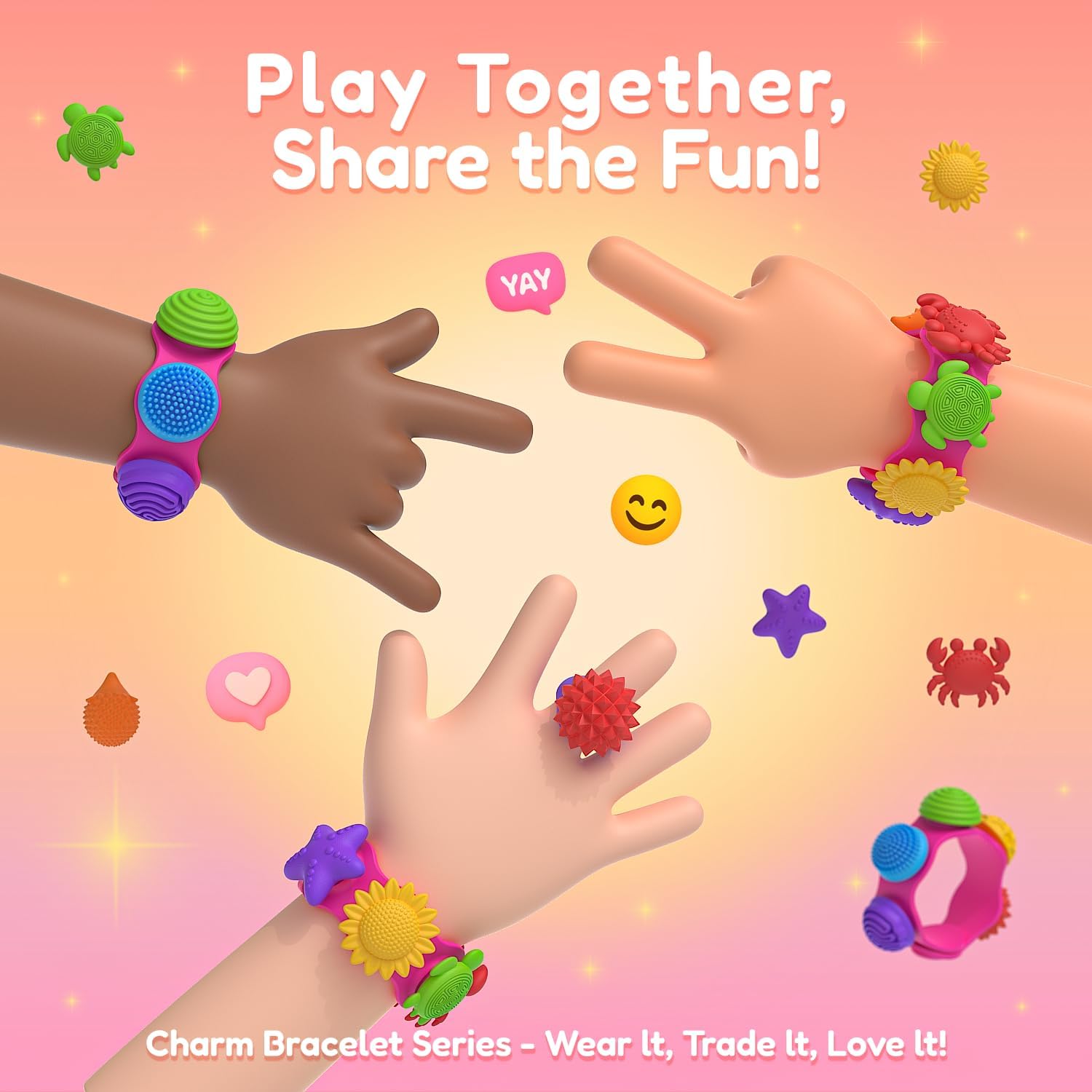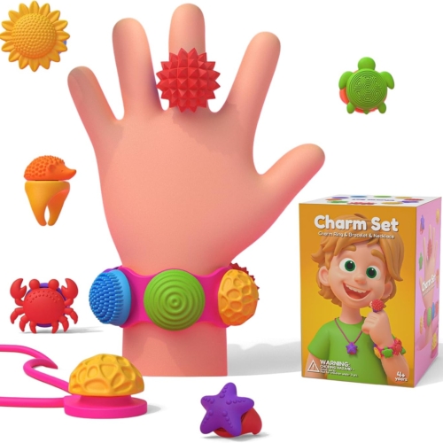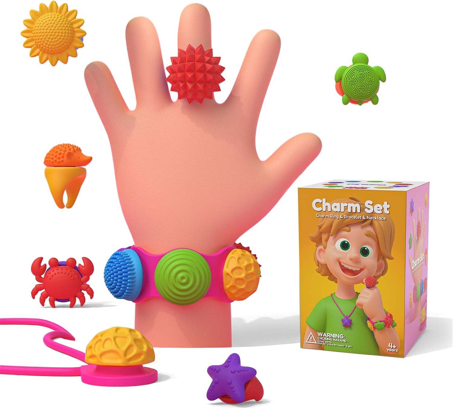 3-in-1 Wearable Sensory Fun: Transform your fidget experience! This unique set includes components to create a custom Fidget Ring, Charm Bracelet, and Necklace, offering three ways for kids to wear and play. Perfect for on-the-go sensory stimulation and discreet fidgeting15 Unique DIY Fidget Charms: Unleash creativity with 10 different silicone sensory charms (starfish, crab, flower, textured dome, etc.). Kids can easily snap, switch, and combine the charms to design their own personalized jewelry, promoting fine motor skills and self-expressionCalming Stress & Anxiety Relief: Designed to engage the senses, the various textures and shapes provide a satisfying tactile experience. Ideal for children with ADHD, Autism, or anxiety, these toys help improve focus, concentration, and emotional regulation in a fun, engaging waySafe, Soft & Durable Silicone: Crafted from high-quality, non-toxic, and soft silicone material, this set is perfectly sized and safe for little hands. The durable design ensures it can withstand endless pulling, twisting, and sensory play, making it a long-lasting addition to any toy collectionThe Perfect GIFTIARA Gift: Encourage social play and sharing! This colorful, customizable charm set makes an excellent gift for birthdays, holidays, or as a classroom reward. It’s a fantastic tool for promoting interactive play and building confidence through creative assembly
