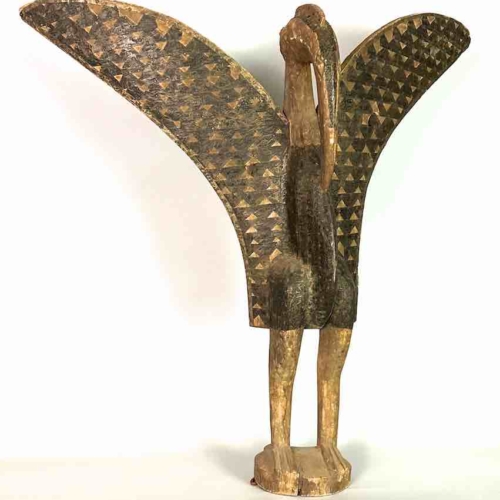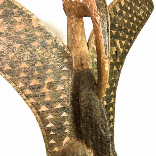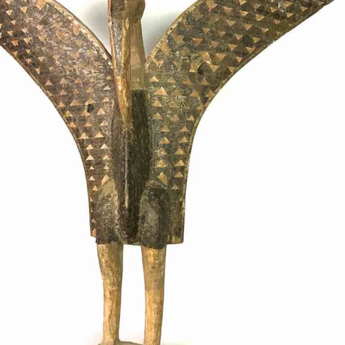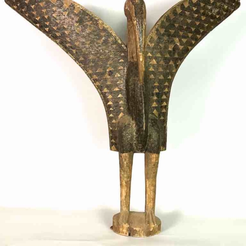 Hornbill statues are used ritually by the Senufo people of southern Mali/northern Ivory Coast. Most of the animals and birds in the environment in which the Senufo and other similar tribes live are venerated for their contribution to the lives of the individuals and the community. This statue is a contemporary replica of the original allowing the artist to exhibit his creativity through the addition and manipulation of some stylistic elements: The basic form of the statue, as in the traditional figures, is the actual bird, the hornbill. Although not genuinely vintage, this figure has been made to appear that it is. This figure measures:34 1/2 x 34 1/2 x 7 1/2″ (88 x 88 x 19 cm)