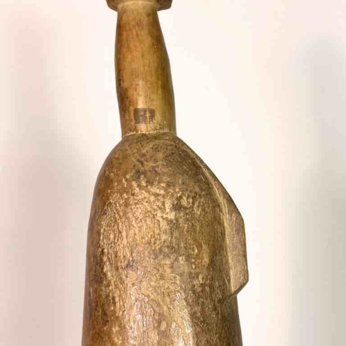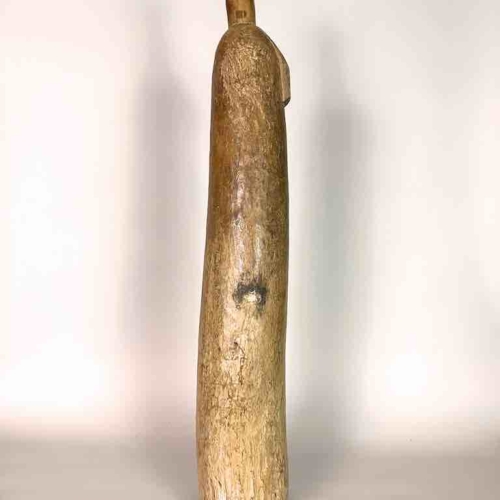 This very old, authentic African wooden wind instrument is a cross between a flute, a trumpet, a horn and a kazoo. It was used for ceremonial, not so much for musical performance purposes, to call the spirits into presence, invoking their influence for the benefit of the community, the village. This is the best of our collection of this type of trumpet. It “floats” on the stand which is provided with this purchase. This beautiful and decorative object measures:39 3/4 x 6″ diameter (101 x 15 cm) 6 3/4″ diameter base (17 cm)