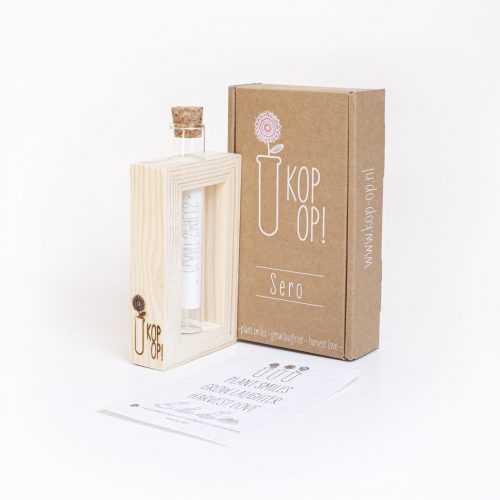 The ‘S er o’ is a pinewood frame lovingly handmade with a glass test tube in it. Our Kop op! Is in the test tube! growing paper with at least 100 small stayer. The seeds of our wildflower, the poppy or the forget-me-not will guarantee that you can enjoy this gift for a very long time. W hen you can specify ordered through the webshop of what flowers you want to receive the paper growth.