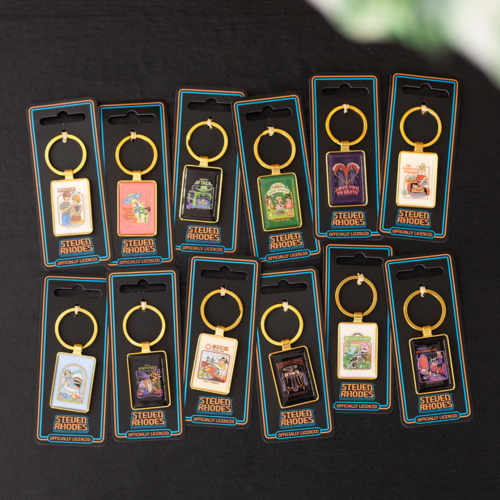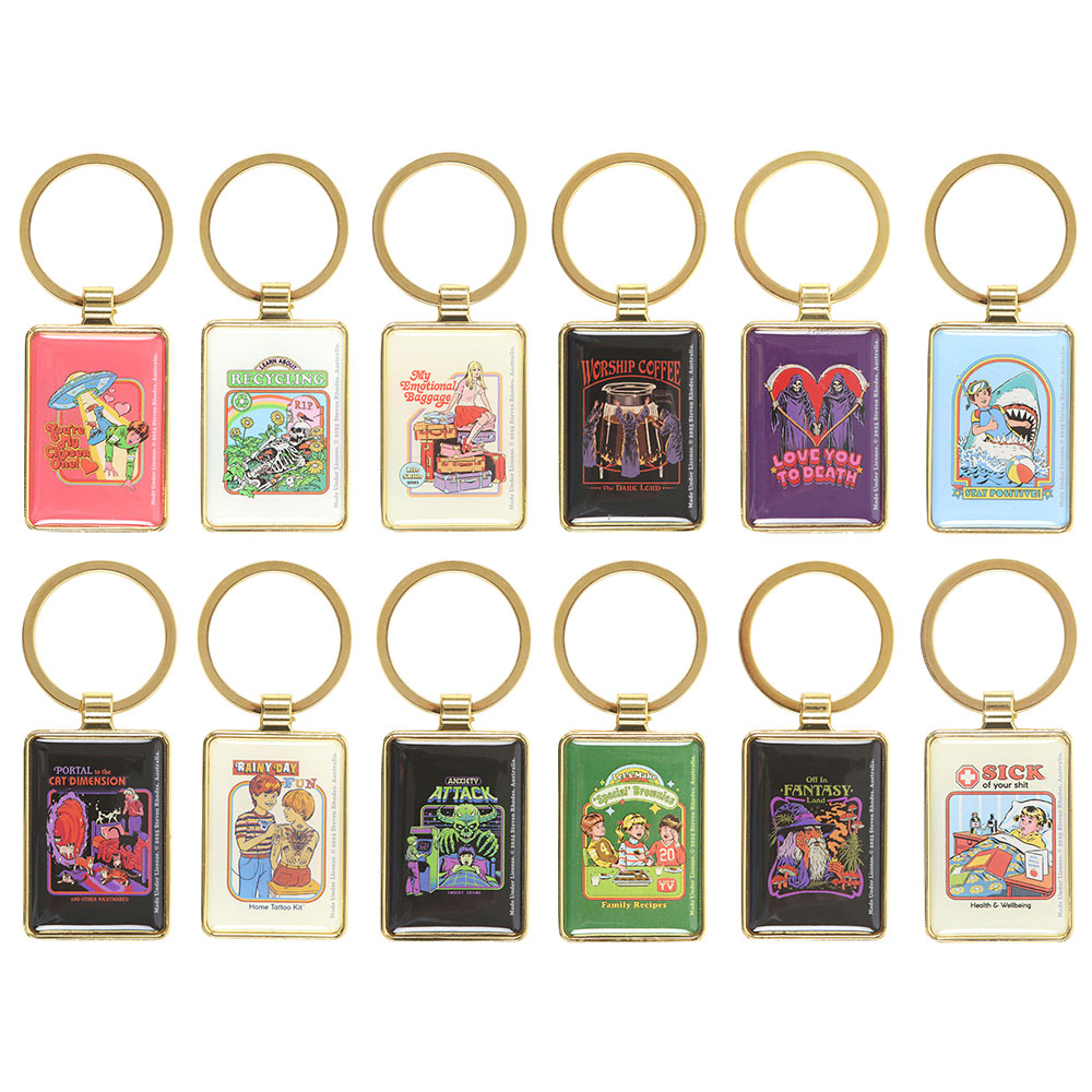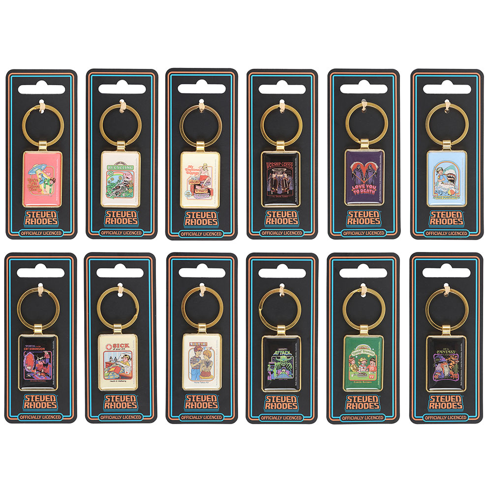 Keep your keyring chaos fully stocked with this top-up pack featuring all 12 irreverent designs by Steven Rhodes. Includes one of each enamel keyring—perfect for refreshing your countertop display or filling in fast-selling favourites. Display not included. Officially licensed and part of the Steven Rhodes collection of iconic retro gifts.