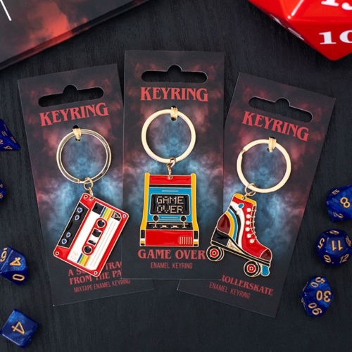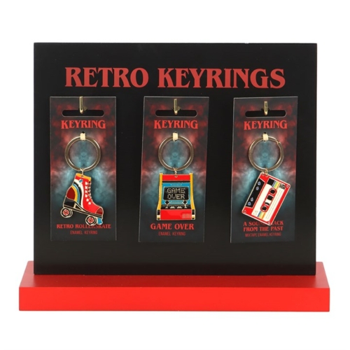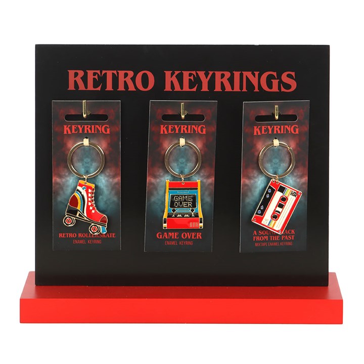 Bring a blast from the past to your shop floor with this set of 24 retro 80s keyrings. Featuring a mix of cassette tapes, arcade machines and roller skates, these quirky enamel keyrings make perfect gifts for gamers, nostalgia fans and 80s lovers. Includes 24 keyrings, equally assorted, on a matching MDF display. Designed by Something Different Wholesale and part of the Between Worlds collection of retro gaming-inspired gifts and home decor.
